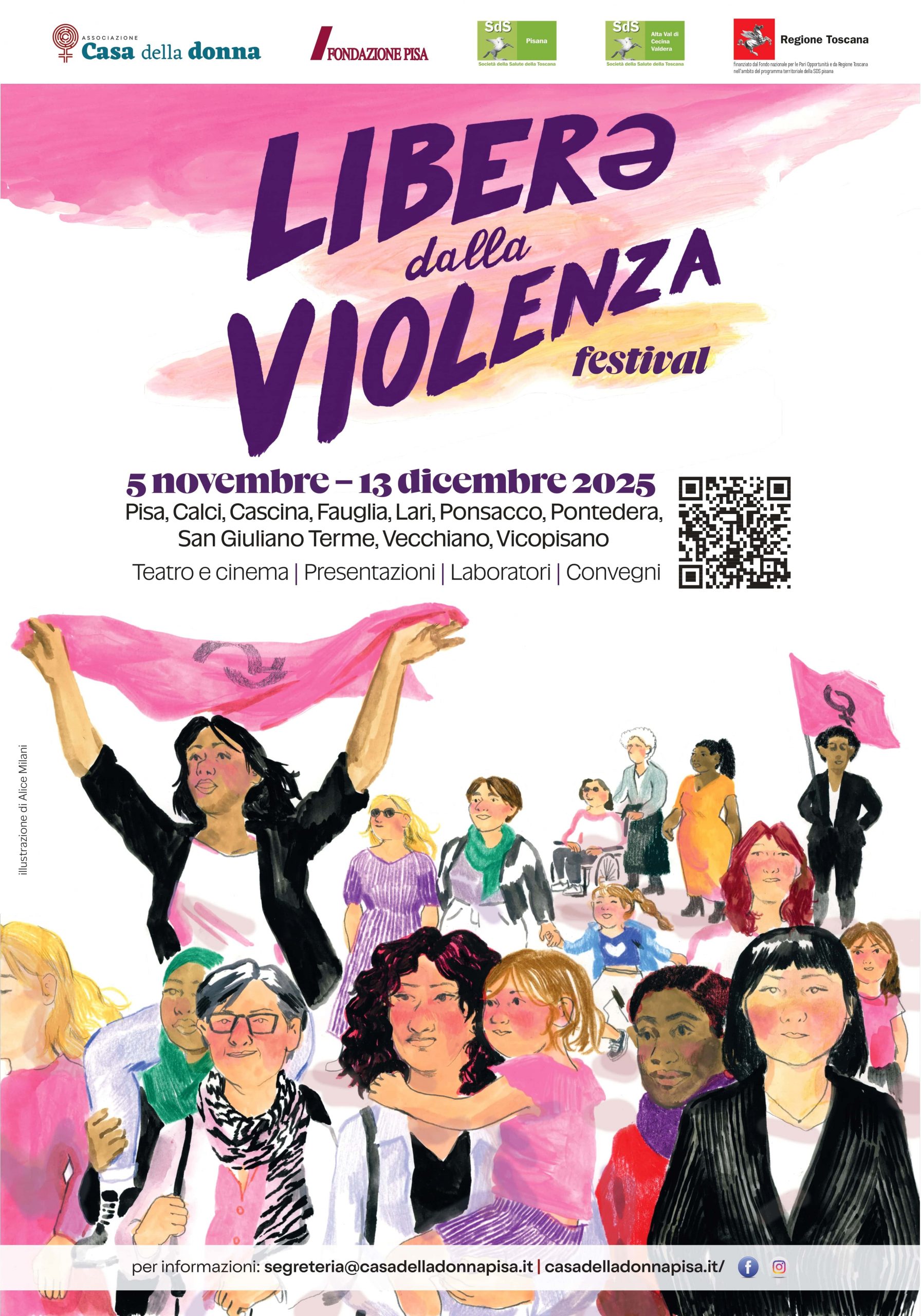 “Liberǝ dalla violenza” è il primo festival nella Provincia di Pisa contro la violenza di genere , nato dal desiderio collettivo di creare spazi di libertà, autodeterminazione e solidarietà. In un contesto politico e sociale che restringe i diritti di donne e persone LGBTQIA+, il festival vuole essere una risposta concreta e corale: una rete di voci, corpi e pratiche che si oppongono alla cultura patriarcale e alla violenza strutturale.