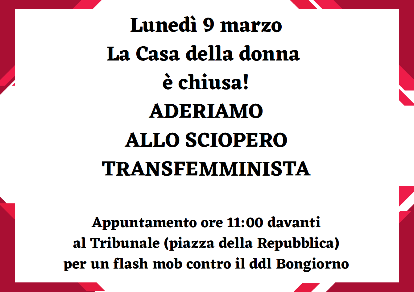 Lunedì 9 marzo la Casa della donna è chiusa! ADERIAMO ALLO SCIOPERO TRANSFEMMINISTA
